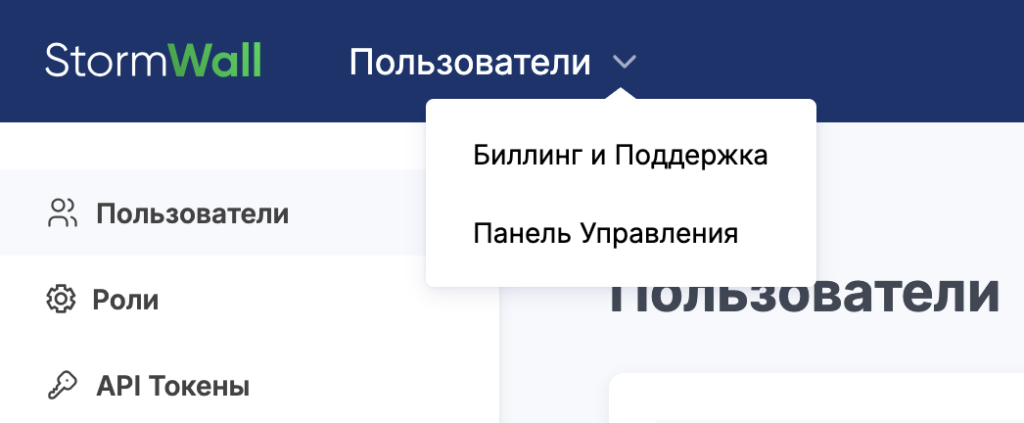 Откройте вкладку Пользователи в верхней левой части экрана. При этом в меню появятся пункты Пользователи, Роли и API Токены.