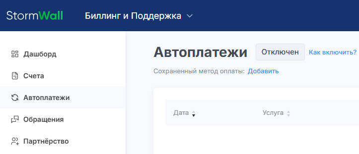 Чтобы настроить автоплатёж, откройте вкладку Биллинг и Поддержка. В главном меню выберите пункт Дашборд.