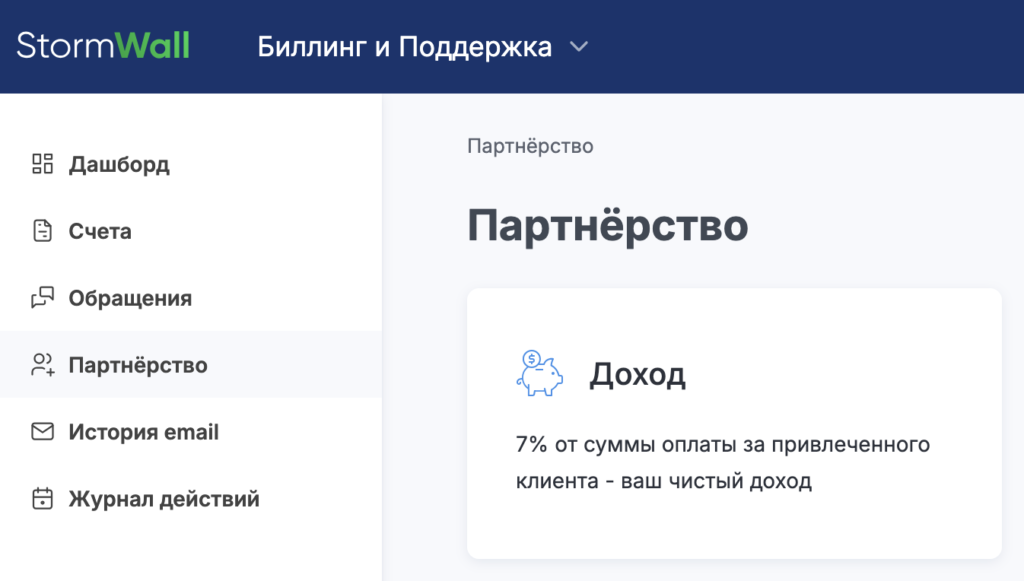 В верхней панели меню перейдите на вкладку Биллинг и Поддержка. В открывшемся слева меню выберите пункт Партнёрство.