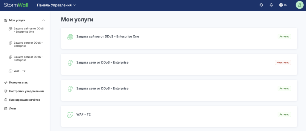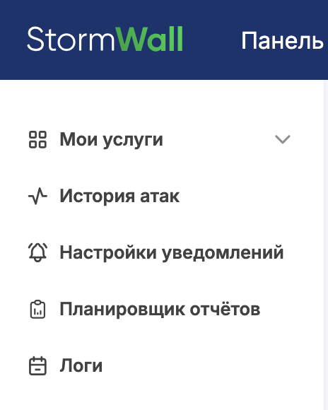 Авторизуйтесь в личном кабинете на сайте StormWall. После успешного прохождения авторизации откроется главная страница — Панель управления.