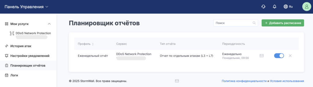 После заполнения формы сохраните новое расписание. Оно будет отображаться в таблице, где вы можете приостановить рассылку (тумблер в правой части таблицы) или удалить более ненужные отчёты.