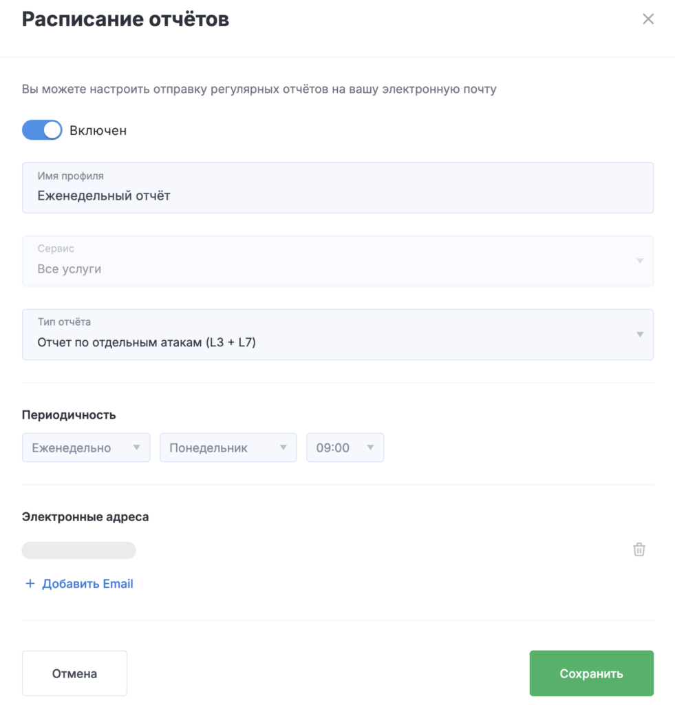 - Имя профиля: дайте своему отчёту понятное название, например, «Еженедельная сводка по главному сайту» или «Ежедневный отчет по L7-атакам».