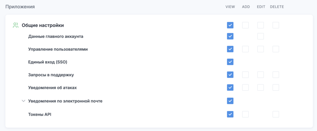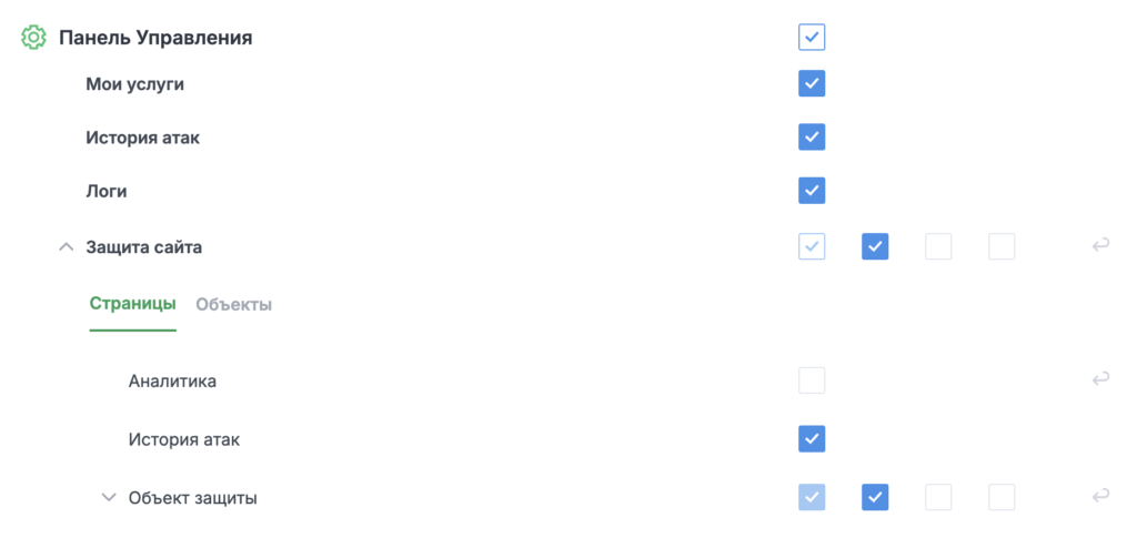 Если запретить доступ к одному из вложенных полей (например, Аналитика), галочка в строке с названием раздела (например, Панель управления) изменит цвет. Это — признак того, что у пользователя будет общий доступ к разделу, но при этом доступны не все подразделы.