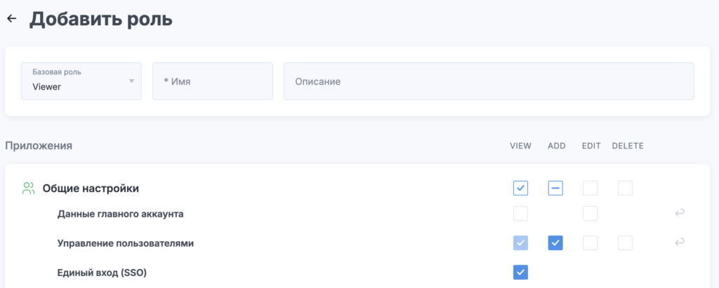 Новые роли создаются на основе базовых. В базовой роли Viewer предустановлены все галочки в чекбоксах поля VIEW, в роли Admin – все галочки во всех полях. Вы можете убирать и добавлять любые настройки, независимо от названия базовой роли.