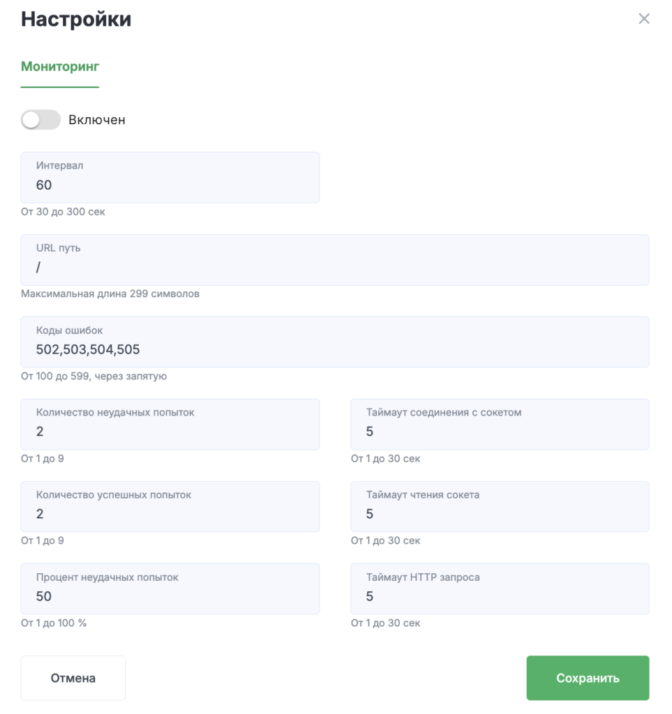 В открывшемся окне вы можете с помощью переключателя включить или отключить мониторинг для бэкенд-серверов, а также настроить параметры: