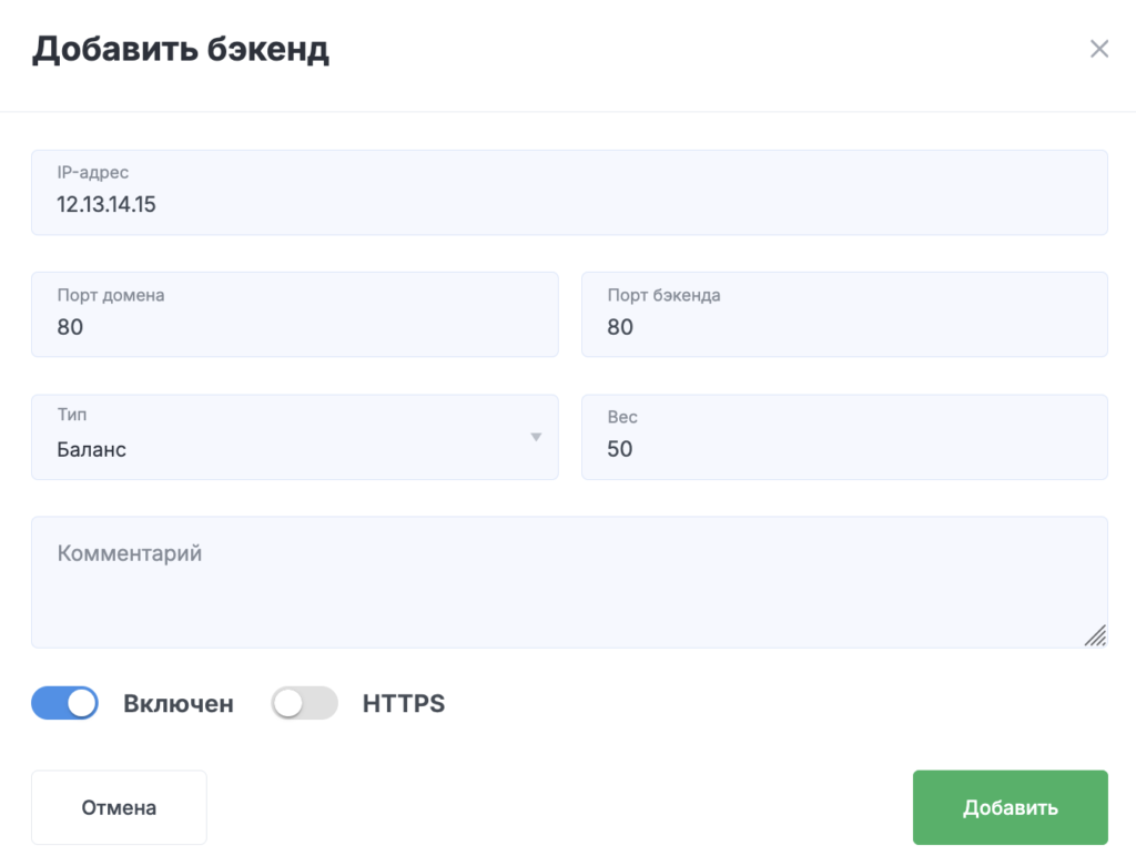 Чтобы добавить бэкенд-сервер, нажмите на кнопку Добавить бэкенд.