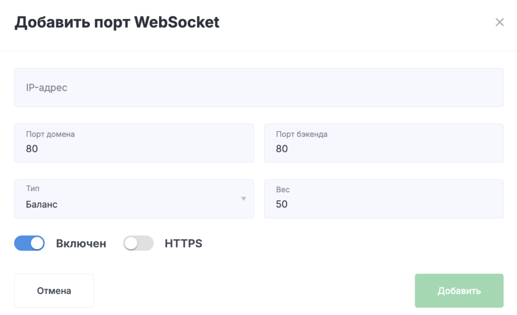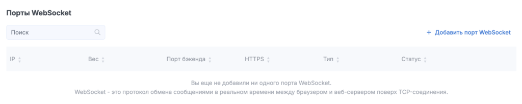 Нажмите на кнопку Добавить порт WebSocket. Заполните форму и нажмите на кнопку Добавить. Если кнопка Добавить порт WebSocket неактивна, значит достигнуто максимальное количество портов.
