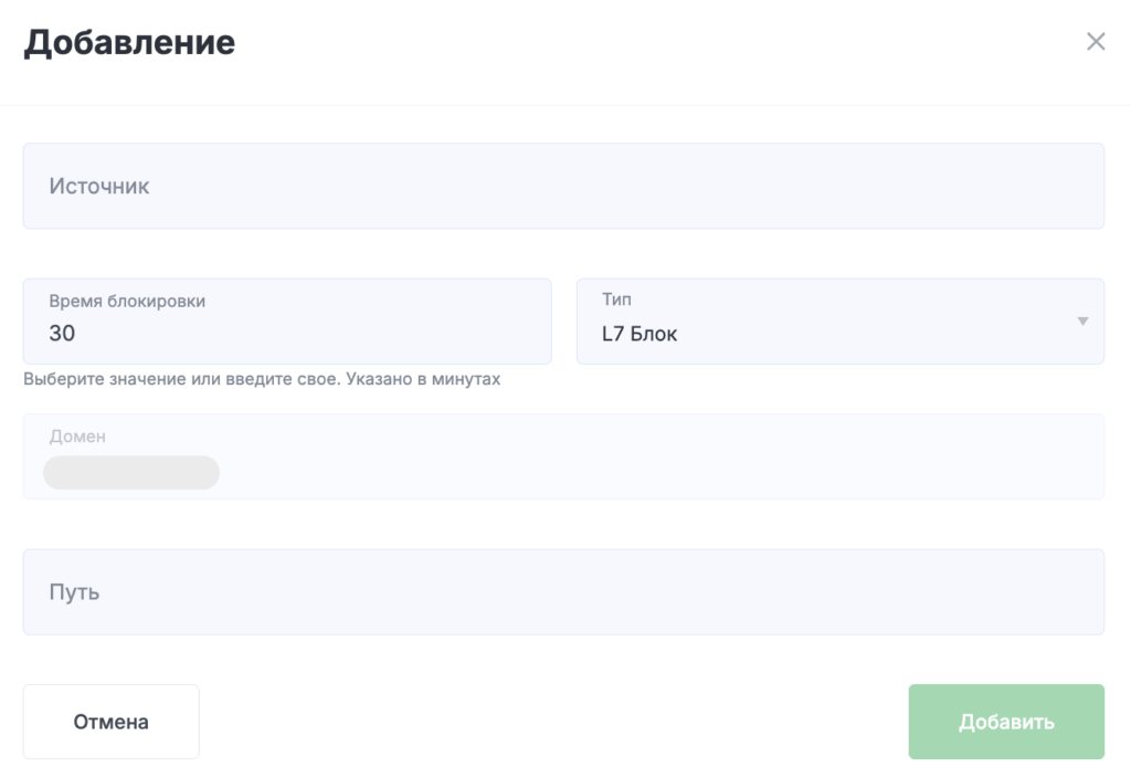 - Путь — относительный адрес (без параметров), для которого будет выставлена блокировка IP-адреса. Если URL не указан, действие распространяется на весь домен.