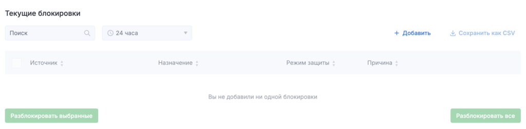 Вы можете удалить некоторые IP-адреса из списка блокировки, установив галочки в их полях и нажав на кнопку Разблокировать выбранные. Также вы можете полностью очистить список с помощью кнопки Разблокировать все.