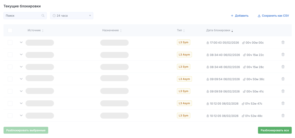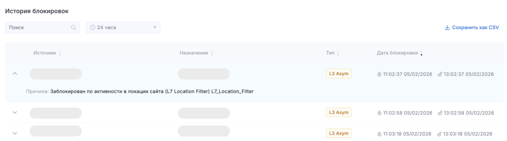 - Тип — уровень блокировки (L3 или L7).