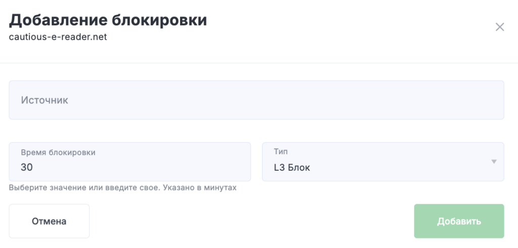 - Время блокировки — период в минутах, в течение которого адрес будет заблокирован;
