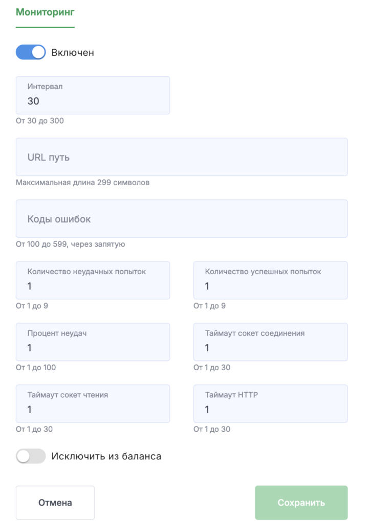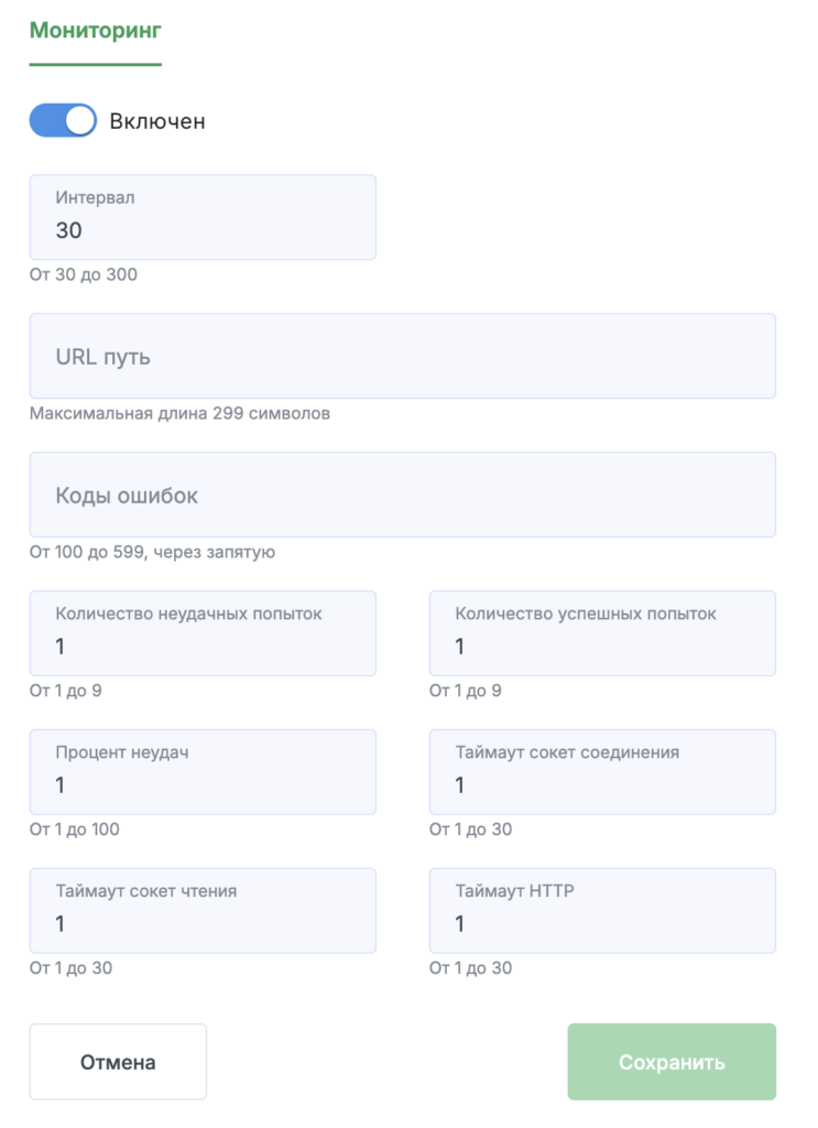 - Коды ошибок — список HTTP-статусов, которые считаются признаком недоступности;