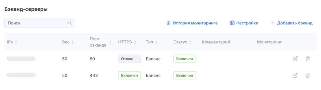 В столбце Мониторинг отображается состояние бэкенда: